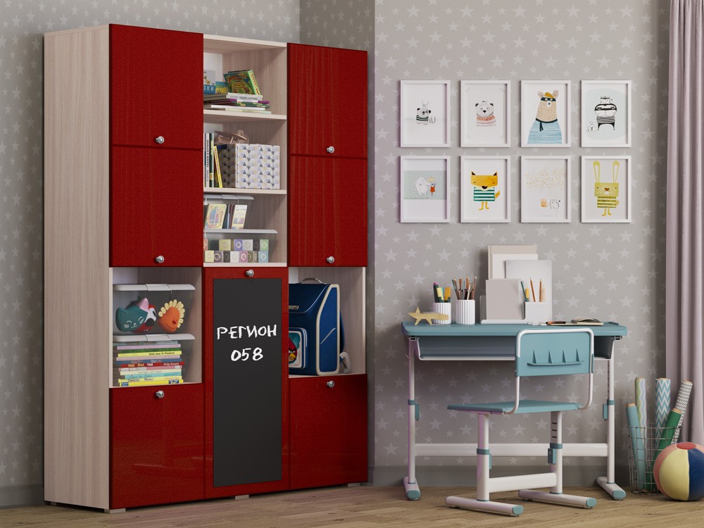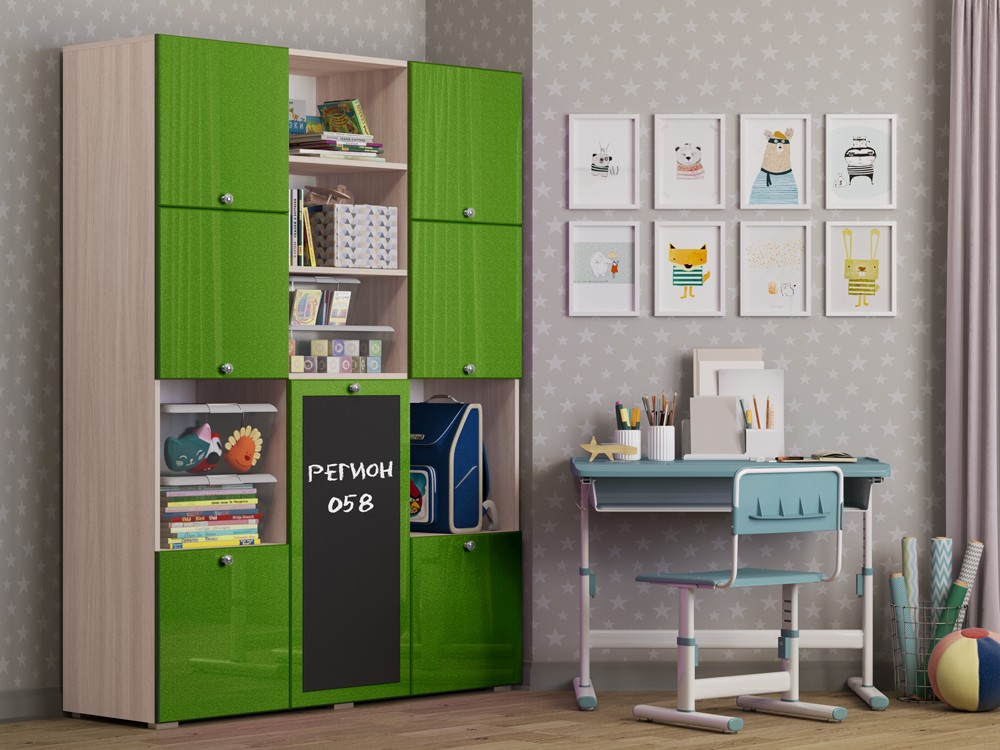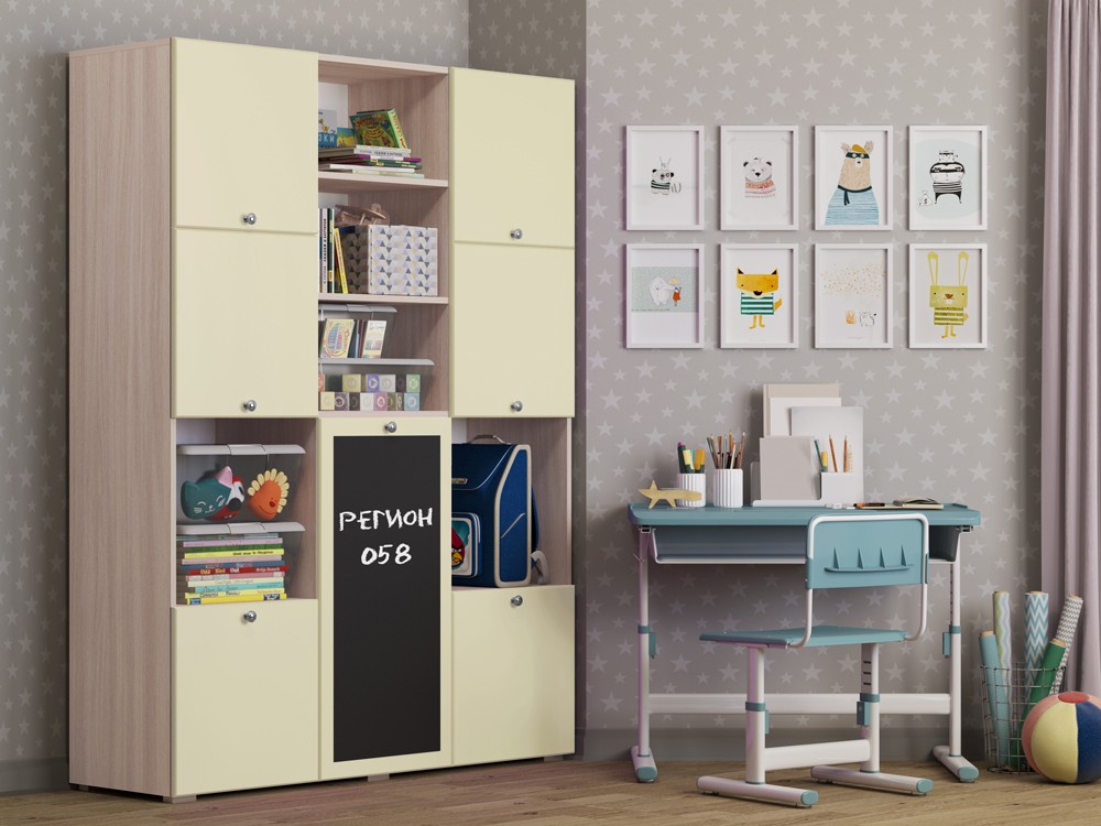 Необычный дизайн, хорошая вместимость шкафа, вешало для детской одежды, завершают образ изящные ручки-кнопки, которые не только красиво смотрятся в интерьере, но и отличаются удобством, долговечностью, безопасностью. Но главной и самой яркой изюминкой шкафа Юнга-11 служит доска для рисования. На ней можно рисовать как мелом, так и специальными маркерами, что позволит Вашему ребенку развивать свое творчество.